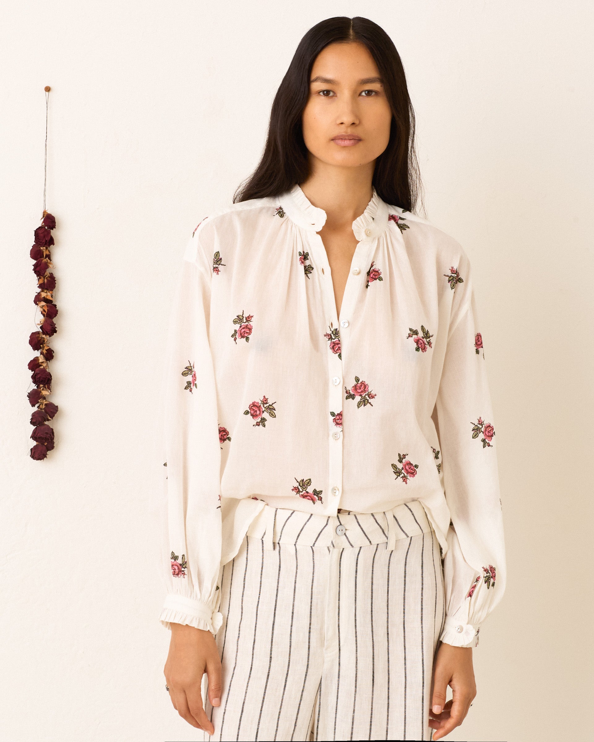 Inspired by a vintage Hawaiian shirt, our slightly cropped striped shirt has an open collar and a mother-of-pearl button front. The viscose-cotton blend shirt is hand-embellished with silver metal coins amid a hand-stitched grid.