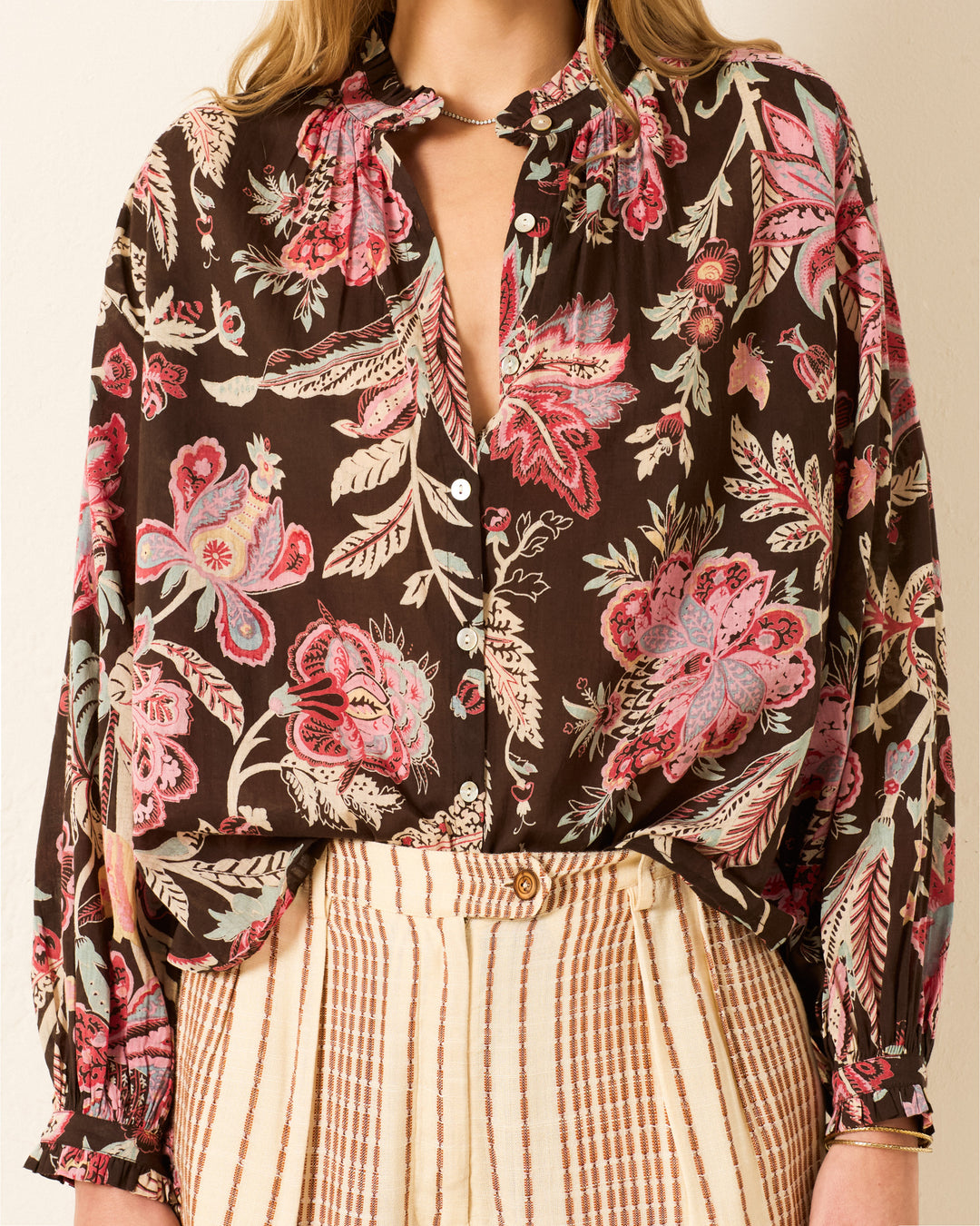 Designed for a loose fit, our cotton voile shirt has a ruffled collar and dramatically gathered sleeves. The vintage-inspired shirt features an earthy floral motif.