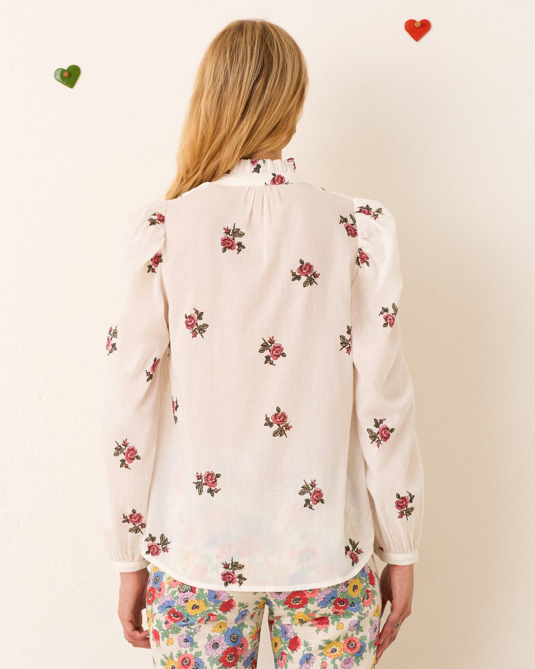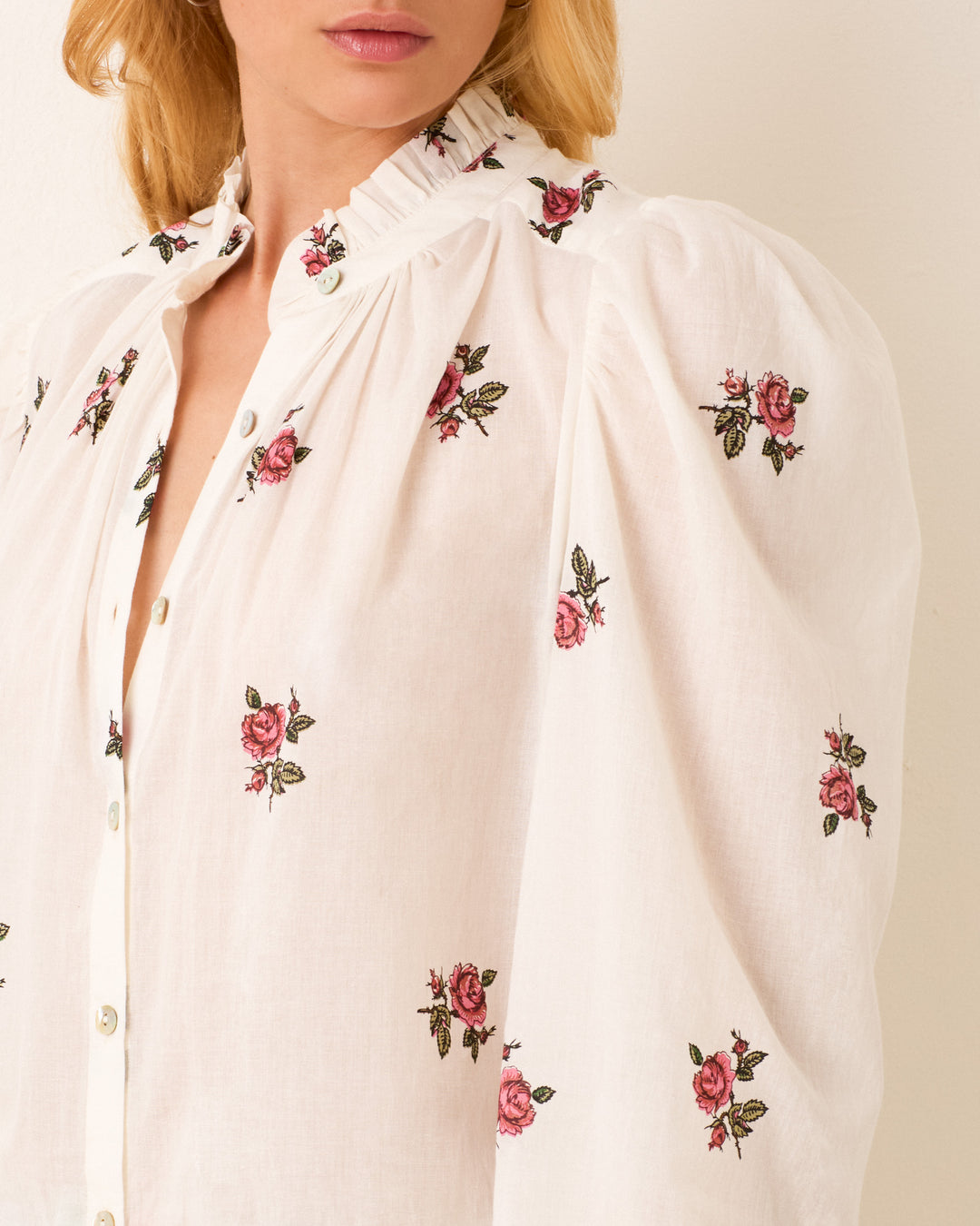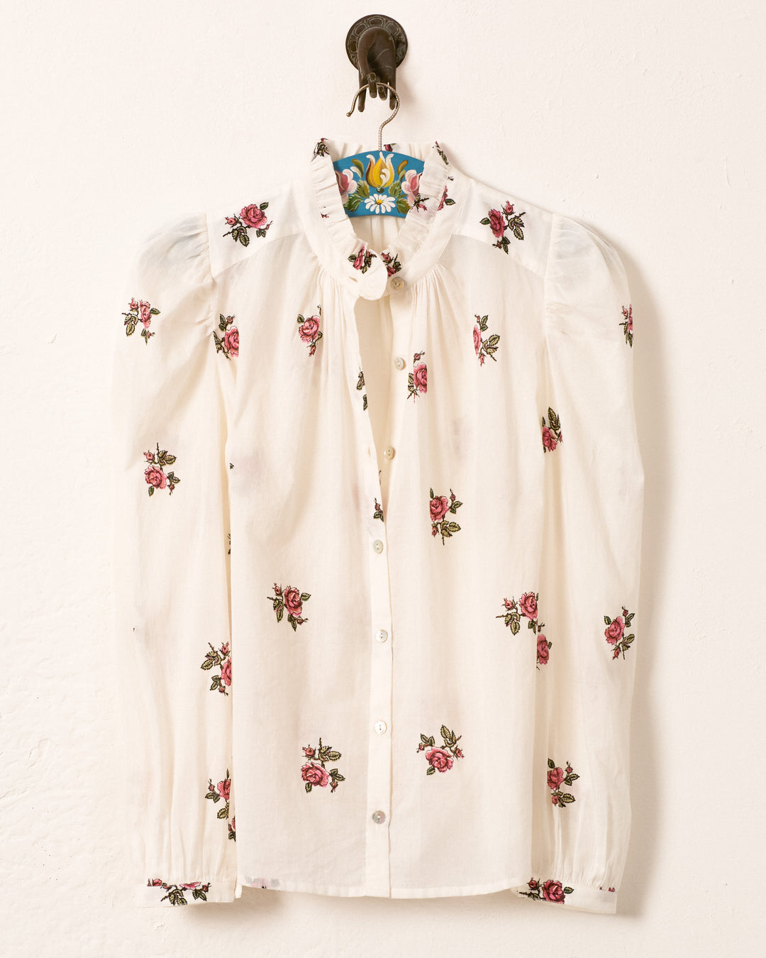 Individually cut by hand, our rose motif shirt has long puffed sleeves, a ruffled collar, and a mother-of-pearl button front. Crafted from cotton voile, the vintage-inspired shirt is finished with French seams.