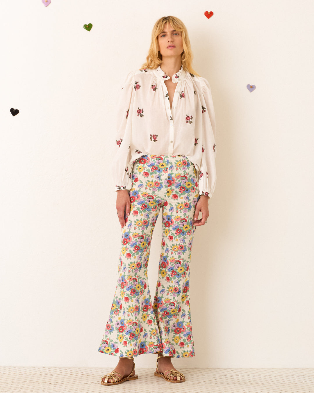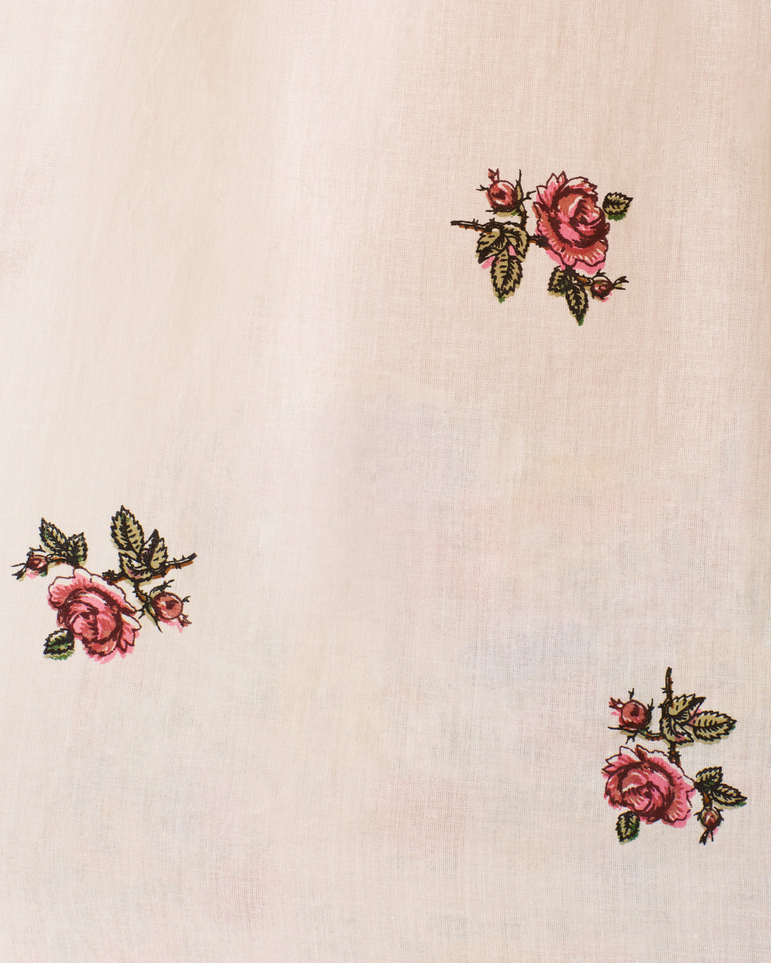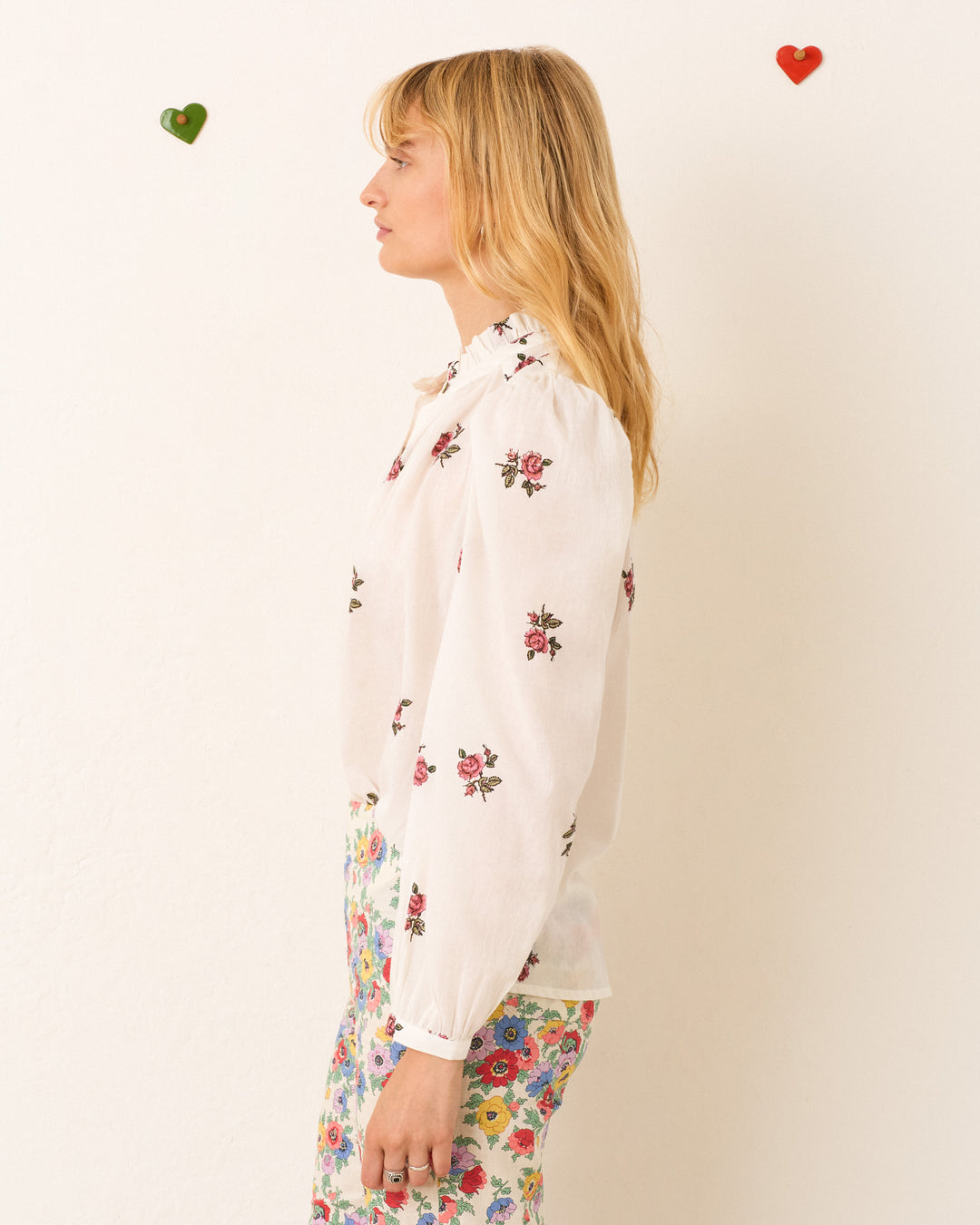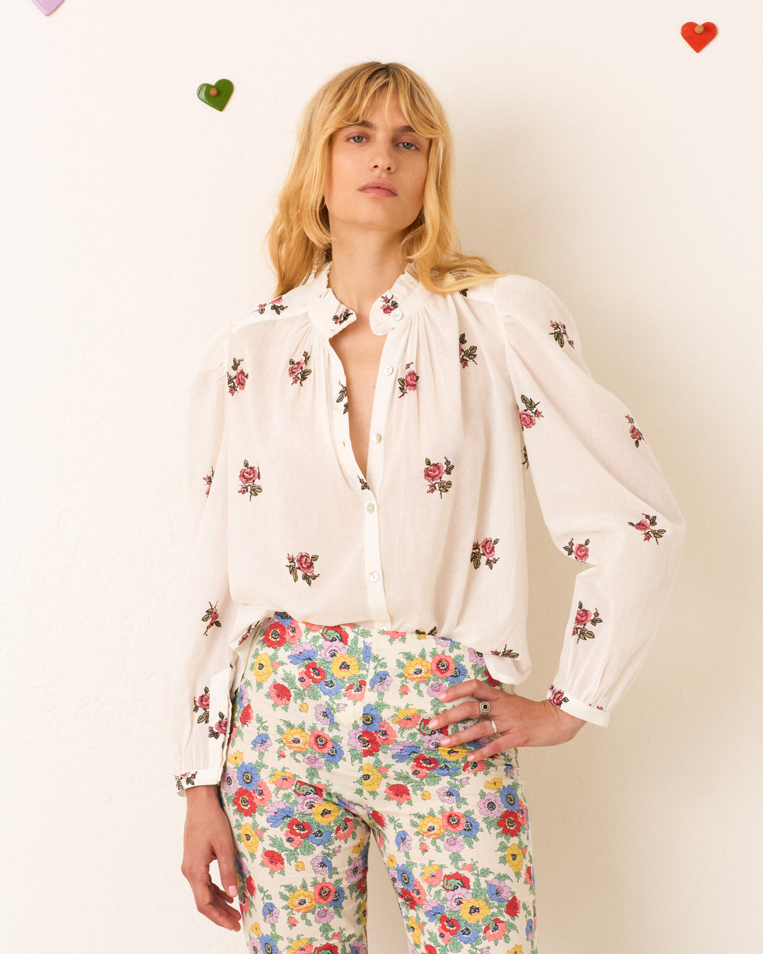 Individually cut by hand, our rose motif shirt has long puffed sleeves, a ruffled collar, and a mother-of-pearl button front. Crafted from cotton voile, the vintage-inspired shirt is finished with French seams.